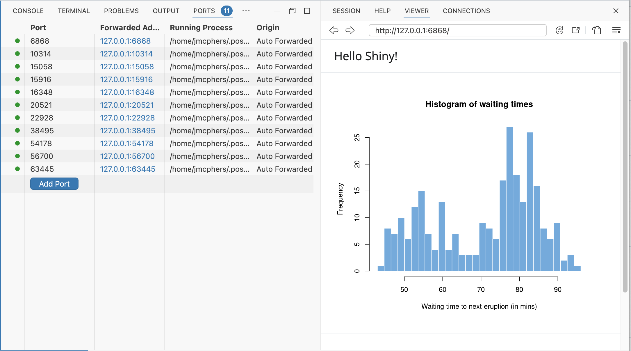 For example, note that this Shiny application running on :6868 automatically gets a forwarded port 6868 on the local host. The Ports tab shows which ports are currently forwarded from the remote to the local host. Positron tries to use the same port on both hosts when it’s available.